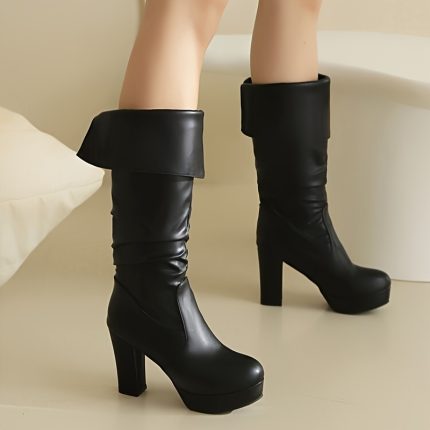 Women’s Black Faux Cover Mid-Calf Boots with Chunky Heel, Slip-On Design, Round Toe, and Comfortable Fabric Lining for Casual Wear