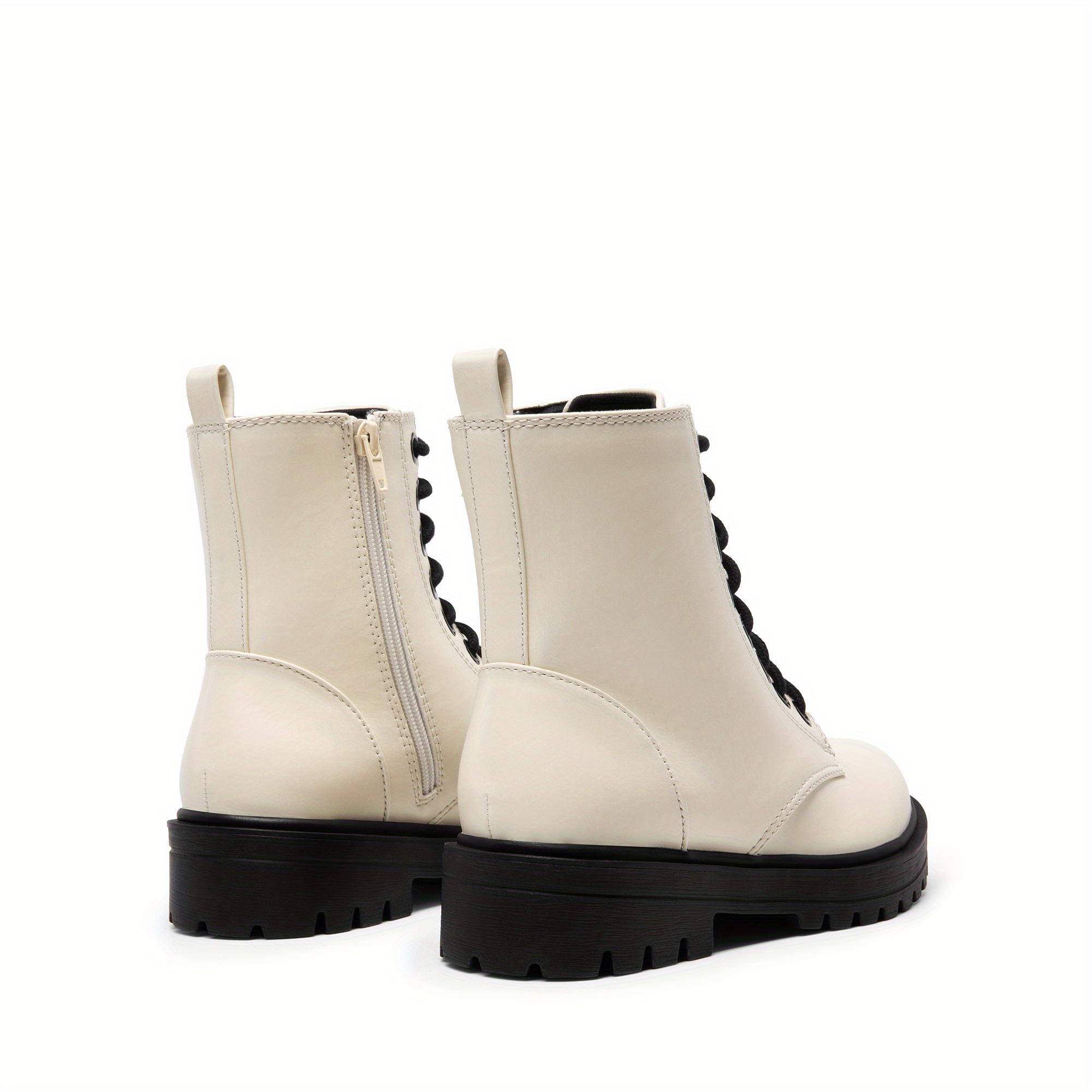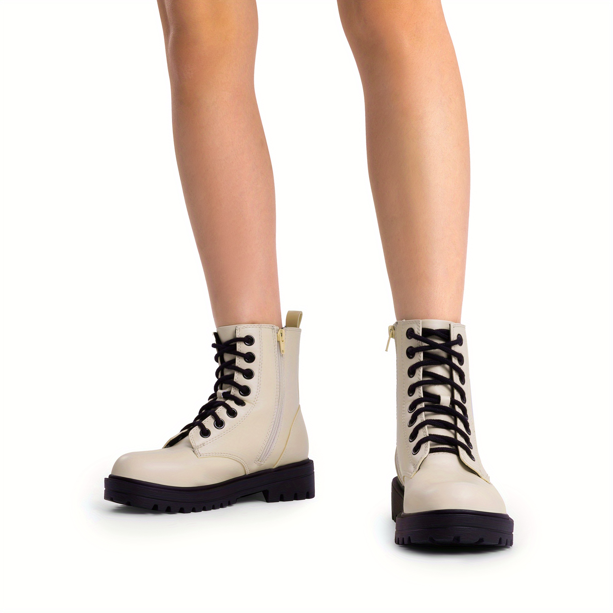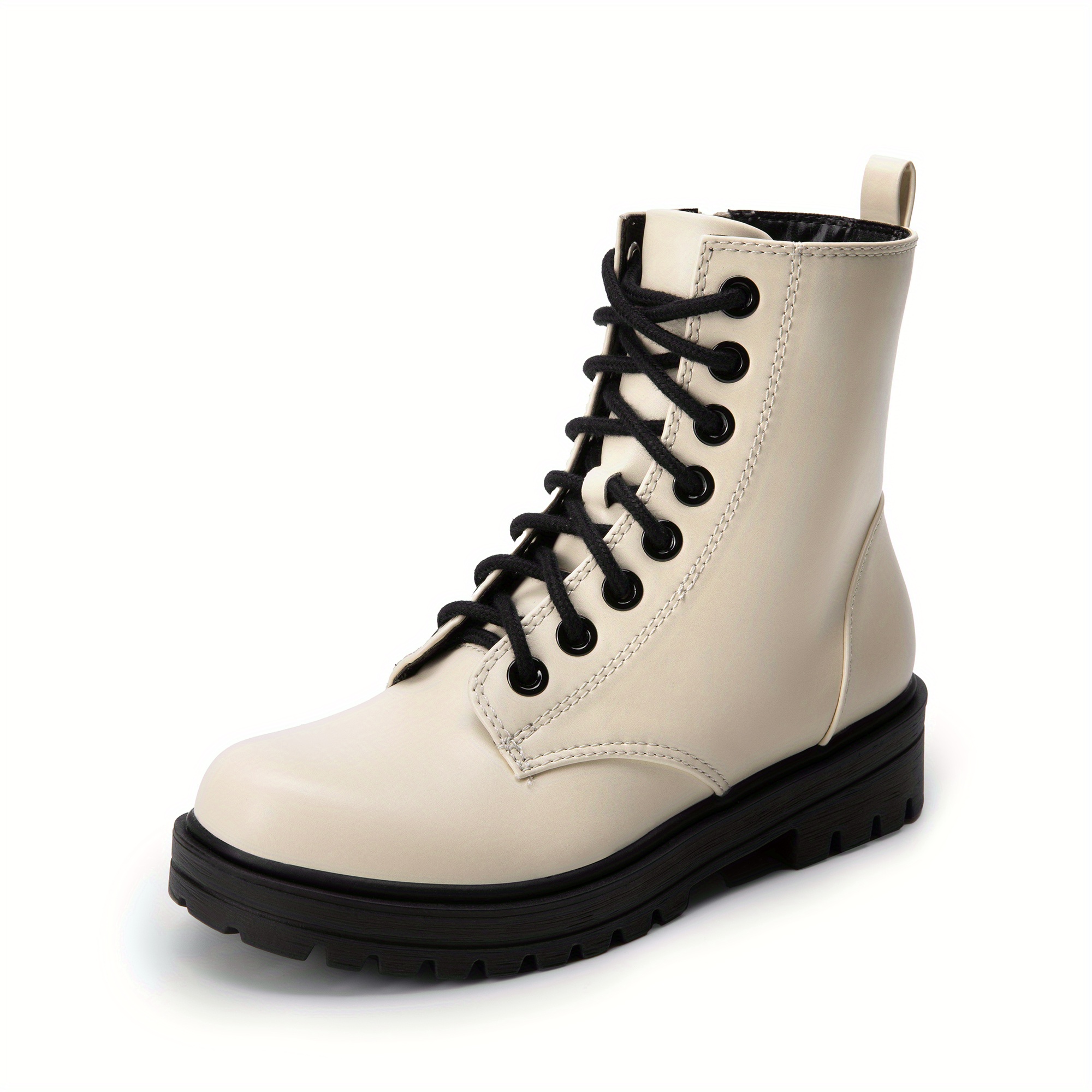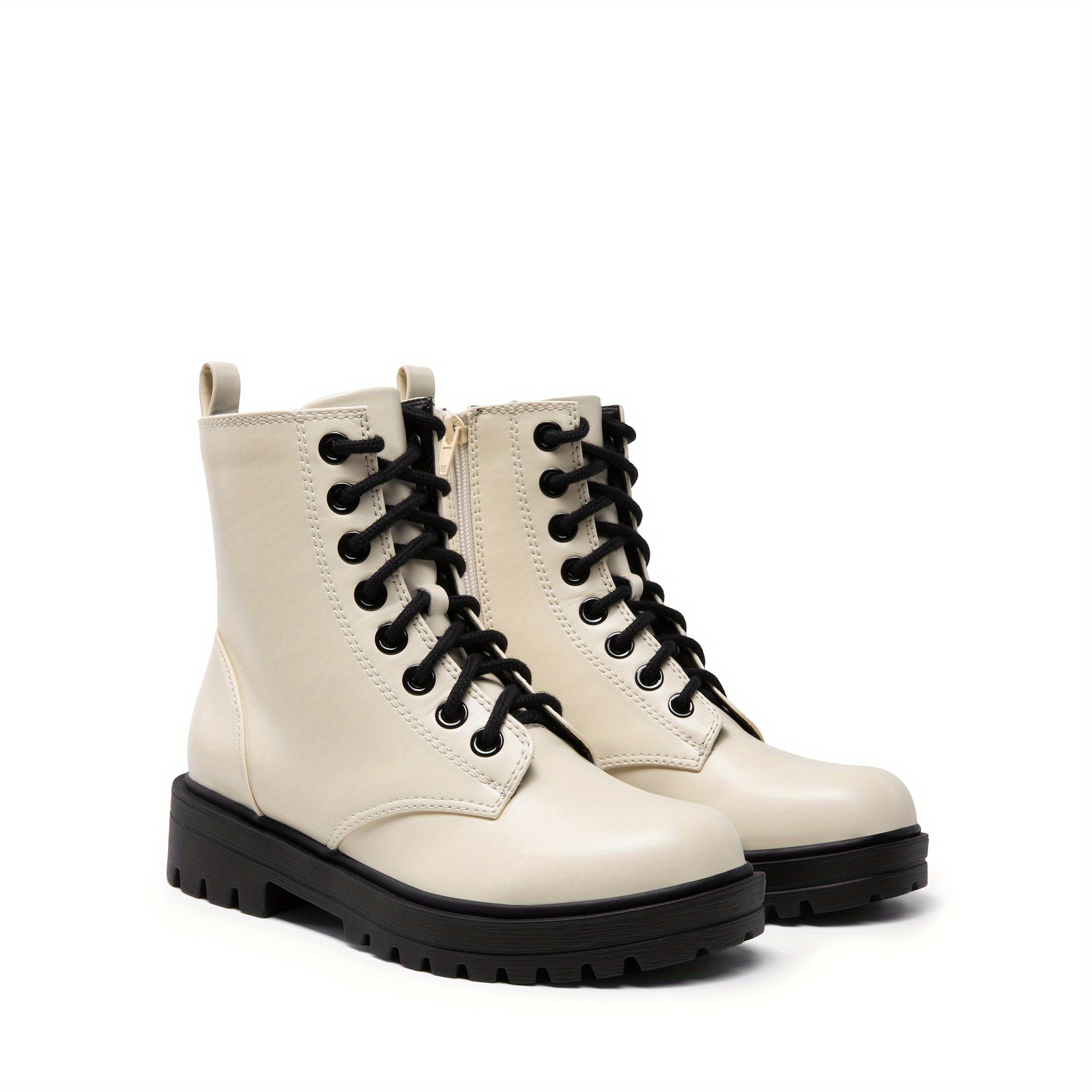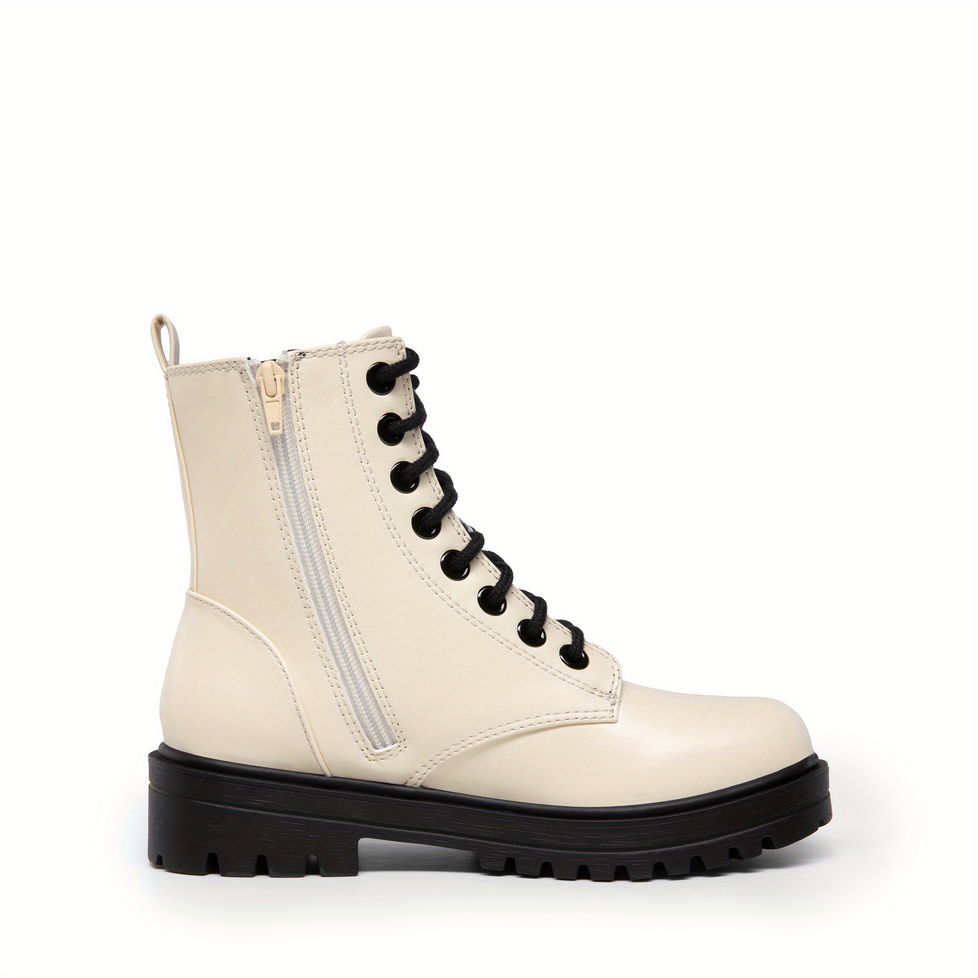 Women’s PU Combat Boots with Side Zipper & Lace-Up Closure – Beige Round Toe Ankle Booties, Flat TPR Sole, -Style Footwear for Urban Streetwear, Casual & – Lightweight Durable Easy-Onu002FDoff