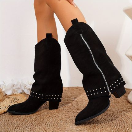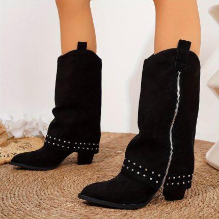 Women’S Chunky Heel Boots – Slip-Onu002FPull-On Closure, Pointed Toe Mid-Calf Boots with Side Zipper, Non-Slip Rubber Sole – Punk Gothic Boots for Women, Winter, Concerts, Parties – Elegant Formal & Casual Outfits – Perfect Gift for Her, Party Footwear, Rivet Embellishments, Fabric Upper, Fashion Enthusiasts, Concert Footwear, Durable Construction, Fashionforward Women