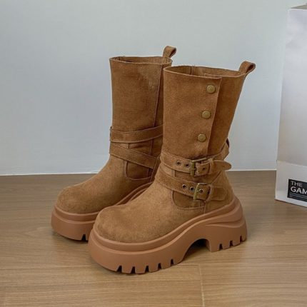 Women’s Chunky Heel Gothic Winter Boots – Slip-Resistant Thick Platform Round Toe Long Boots with Buckle Strap & Arch Support, Faux Cover Upper & Rubber Sole, Brownu002FBlacku002FBlack – Hand Washable Winter Shoes for Women (Tallu002FShort Height Options Available) – Chunky Heel, Faux Cover Round Toe Slip-On Design, Cushioned Insole, Versatile for Casual & Formal Wear, Ideal for Cold Weather, Vintage Boots for Women, Warm Fleece Lined Boots, Slouch Boots, Heels for Women,